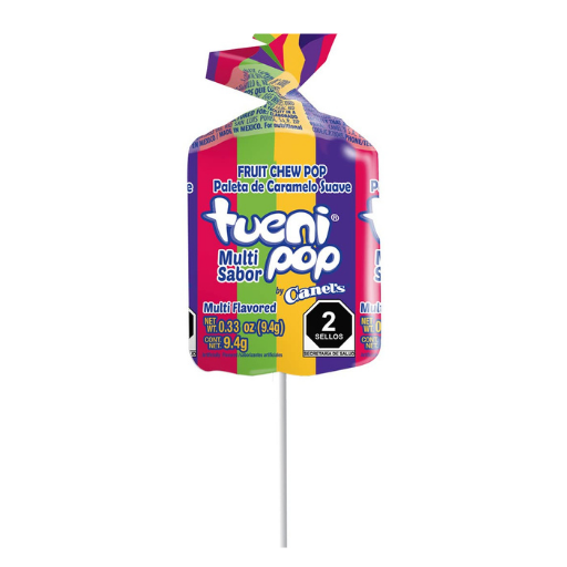 The “TUENI POP MULTI SABOR 9.4 G” is a small, individually wrapped, multi-flavor popping candy product from the brand Canel’s. It features a mix of fruit flavors like lime, grape, pineapple, and cherry, and is designed to pop in your mouth due to pressurized carbon dioxide in its sugar and flavor base